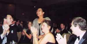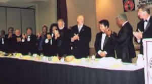 A surprised Mrs. Sanchez stands up to be recognized by her husband, Grandmaster Frank E. Sanchez.