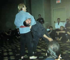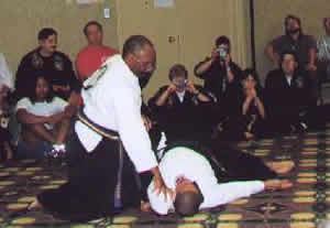 Soke Harris Warren of Florida performs a submission technique on sensei Jose Rodrigues.