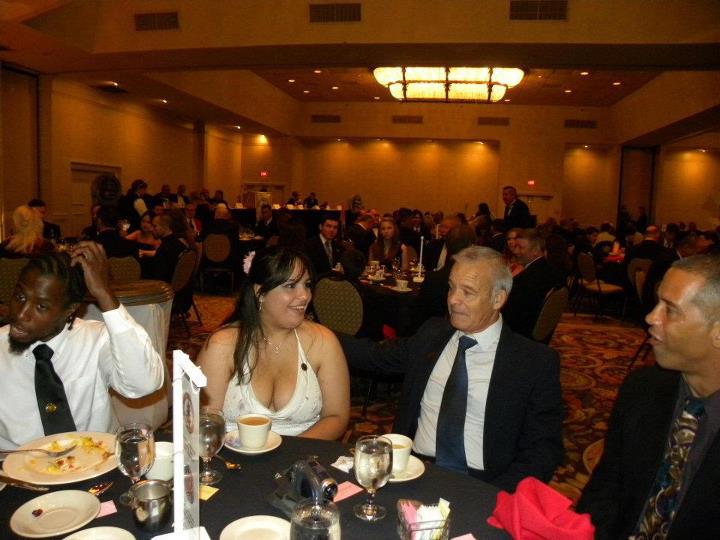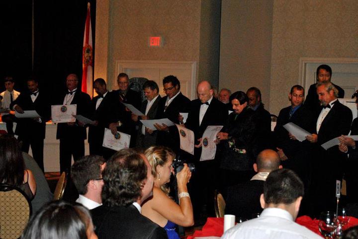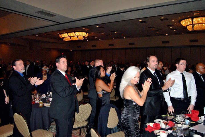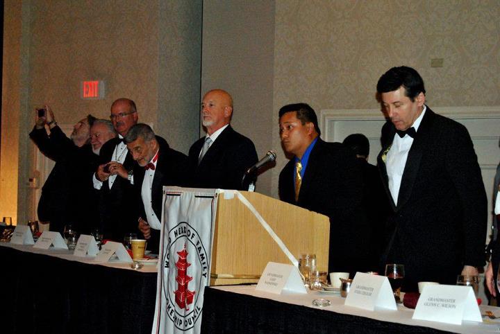 Head table rises in acknowledgement (only a portion of Head Table showing) - (L to R) GM Dan Verkerke, GM John Byrne, GM Phil Little, GM Vincent Marchetti, Prof. Gary Dill, emcee - Sensei Matthew Sanchez and GM Gary Wasniewski