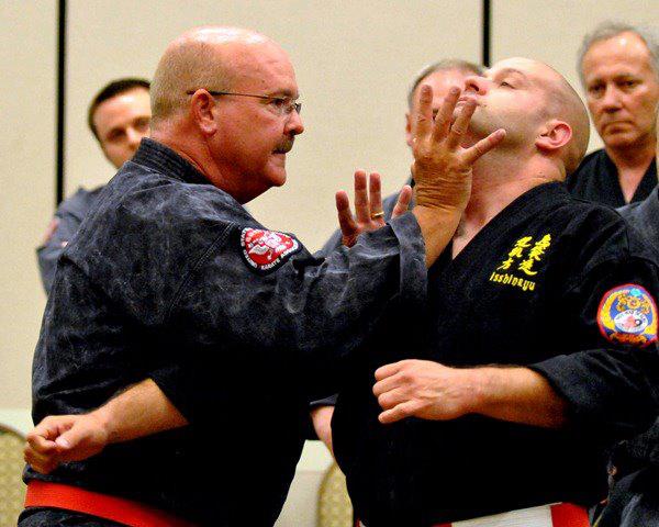 The inheritor of Long-Shimabuku Isshin Ryu, GM Phil Little closes the gap quickly with a palm heel strike to the chin in his seminar