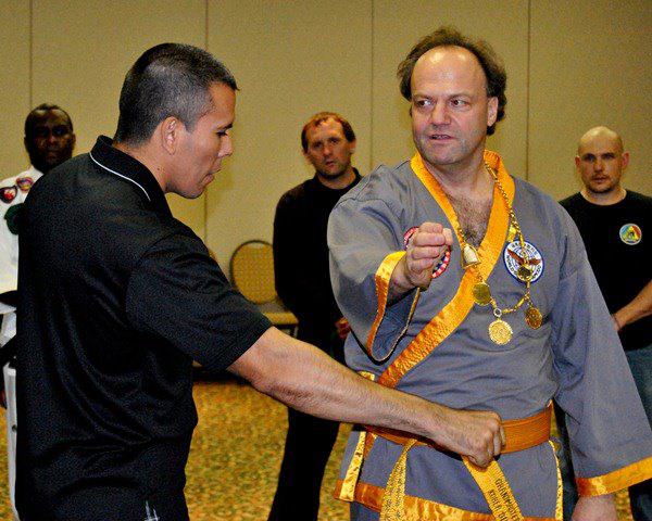 GM Juerg Ziegler AKA "Lightening Fist" from Switzerland shows proper fist positioning to a seminar participant during his seminar conducted with a mending broken back (NOTE: GM Ziegler traveled to America to conduct this seminar against the advice of his Doctor because he gave his word that he would conduct a seminar. A true martial arts warrior in every sense of the word!)