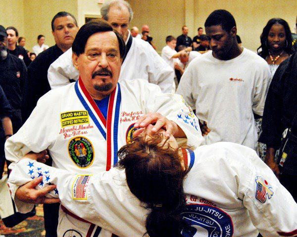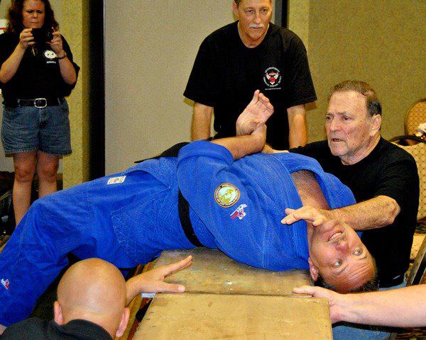 Professor John Casarez demonstrates a technique from his system of Manabi Masho Jui-Jitsu on Sensei Solitaire McAllister