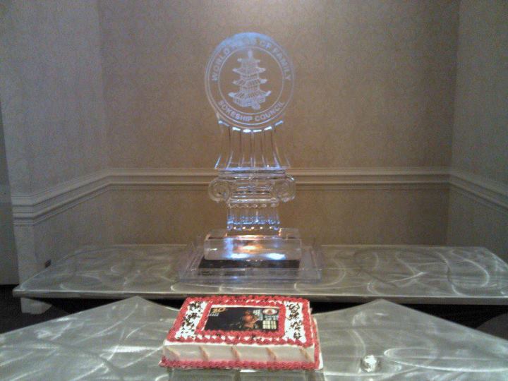 Beautiful ice sculpture of the WHFSC Logo stands regally in background of 20th Anniversary cake