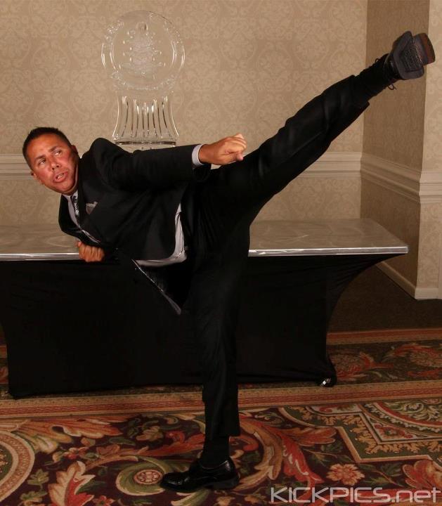 WHFSC Official Photographer, Stace Sanchez of KickPics poses for his own photo with a high side thrust kick in front of WHFSC ice sculpture