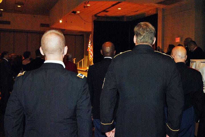 Soldiers in uniform come to front of the stage to face flag as "God Bless the USA" is sung in beginning of banquet