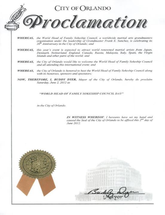 Proclamation from the honorable, Mayor Buddy Dyer of Orlando, Florida declaring the 2nd day of our function on June 2nd as "World Head of Family Sokeship Council Day"!