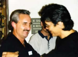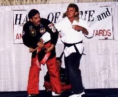 Professor Frank E. Sanchez (left) and Professor Wally Jay share a moment at a martial arts tournament.