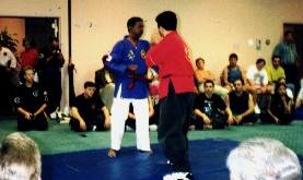 Grandmaster S. Srinivisan of India (in blue gi top) prepares to demonstrate a technique on fellow WHFSC member, Master Amir Ardebily
