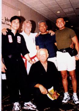 "Buddying it up" at a WHFSC function are (L to R) Masters Don Wilson, George Alexander, Ron Van Clief, a guest and Prof. John DeNora (kneeling)