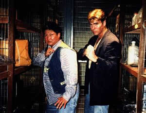 Don "TheĀ Dragon" Wilson, Grandmaster Glenn Wilson and Cynthia Rothrock take a break from filming the movie "Redemption"