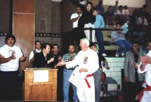 Grandmaster Don Nagle (red belt) one of the leaders of Isshinryu in America receives certificate from Soke Sanchez