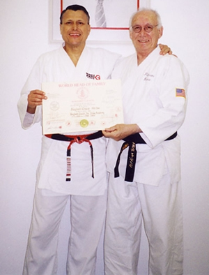 Grandmaster Ray Geraneo (left) with student pose for the camera