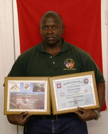 | GRANDMASTER LEON WRIGHT from Virginia, currently serving as a Civilian Contractor in Afghanistan received 2 awards from the U.S. Military for teaching martial arts in Afghanistan for the last 4 |