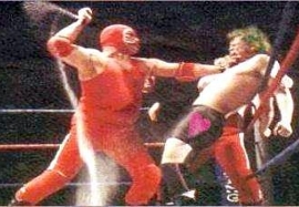Dr. Richard Hackworth aka wrestler, "Rick Love" prepares to take the onslaught of Japanese wrestler Kendo Nagasaki-Richard's "action figure "(below)